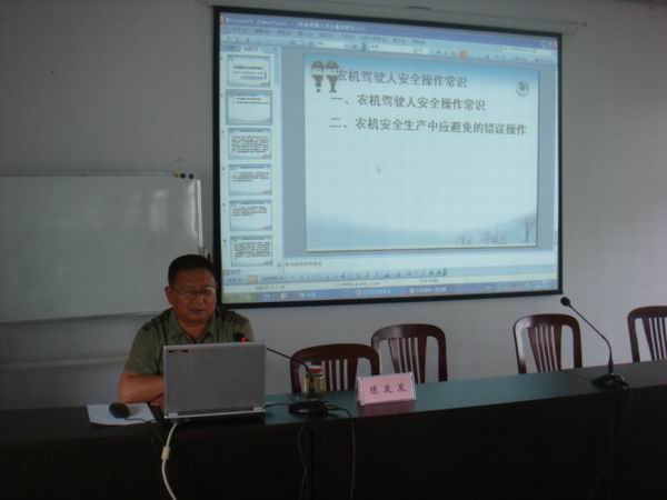 此次培训,邀请了南京市农机安全监理所池树安、江宁区农机安全监理所陈友发同志就“农机安全”做了专题讲座,内容涉及“农机驾驶操作知识”、“农机安全法律、法规”、“农机安全监理相关规定”等方面。与会人员还观看了《农机安全教育警示片》。
