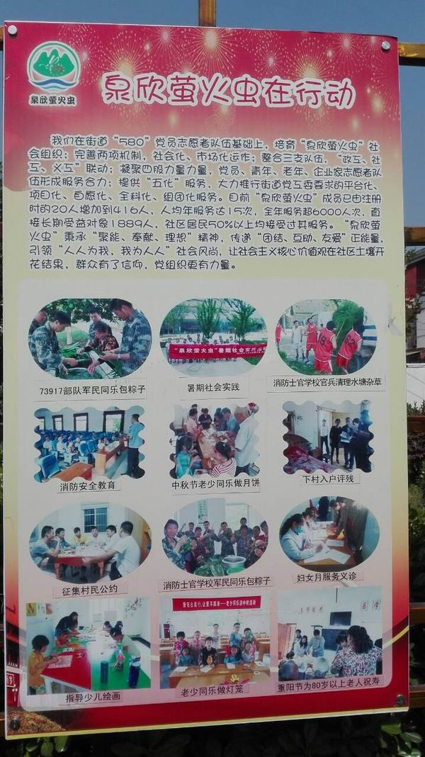 “泉欣萤火虫”社会公益组织为居家养老、帮困助残、就业指导、民调帮扶、家政咨询、突发事件救助等提供了一系列的社会公益服务,为孤寡老人在经济保障、健康医疗、日常照料和精神慰藉等方面得到了社会多方面的支持和关注,并以此为平台培植居民对社区的认同感和归属感,调动社区成员参与社区建设的积极性和参与意识,为构建“人人为我,我为人人”的良好社区风尚,共同建设文明、和谐社区作出了不少贡献。